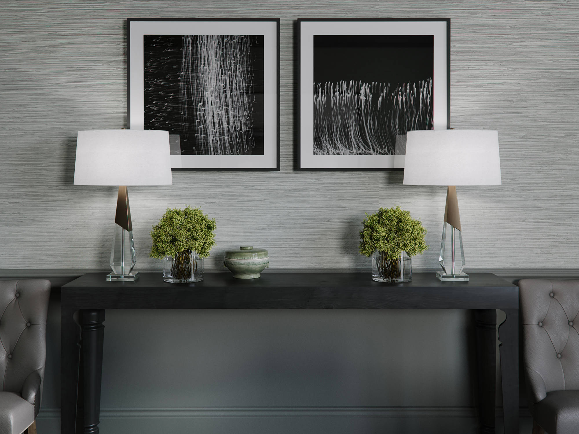 A carved crystal body is accentuated with an asymmetrical Antique Brass cap detail on this table lamp. An Off-White linen oval shade tops the lamp and a rectangular crystal base acts as the foundation. If your living room is in need of a shot of soft glamour, look no further.