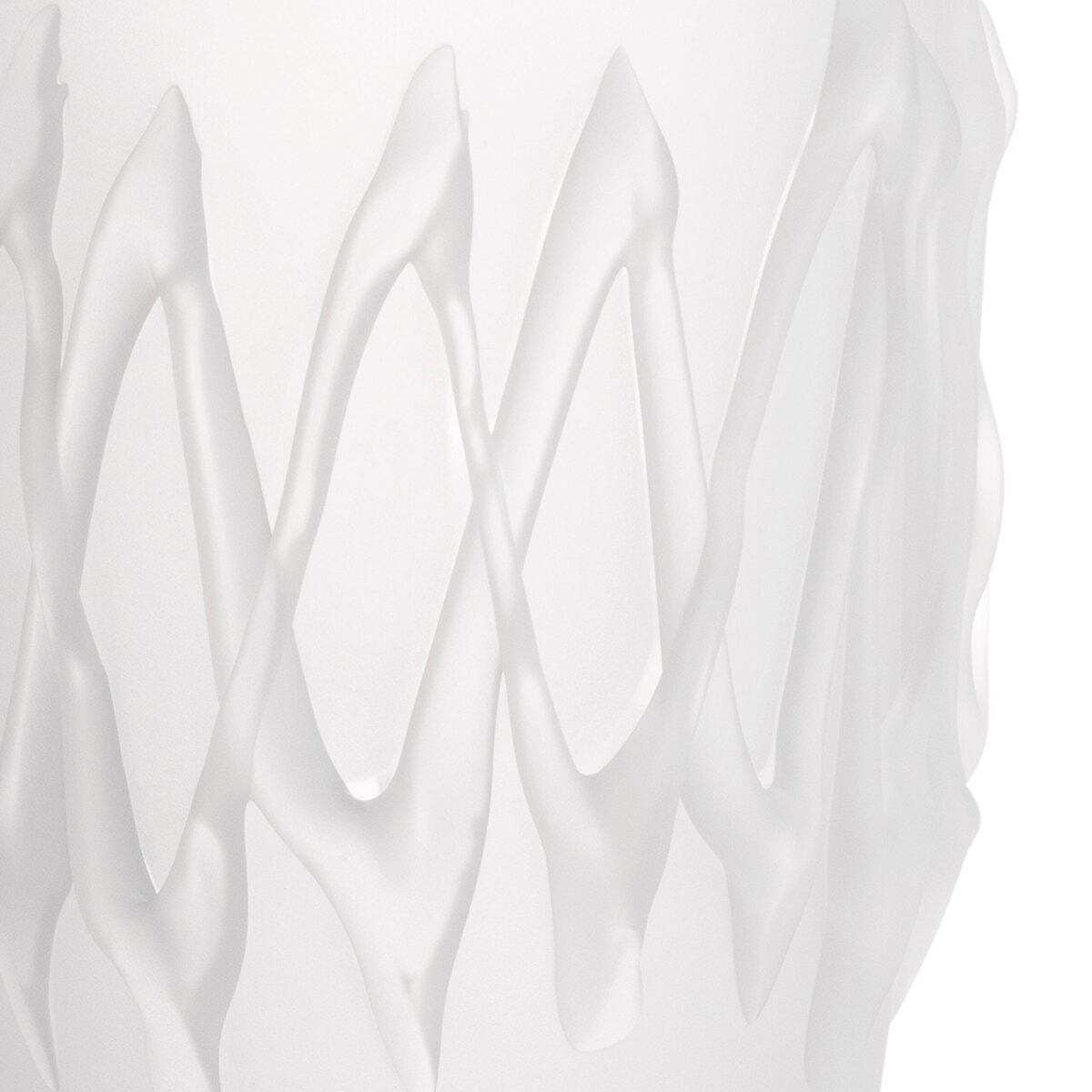 Frosted glass construction gives the Avellino Small Vase an ethereal quality, its weightless appearance grounded by its substantial heft. This piece is decorated with a raised pattern that zigzags across its center. Watertight construction makes this vase ideal for fresh cuttings – its neutral coloration offers a flattering fit for flowers and foliage of every variety.