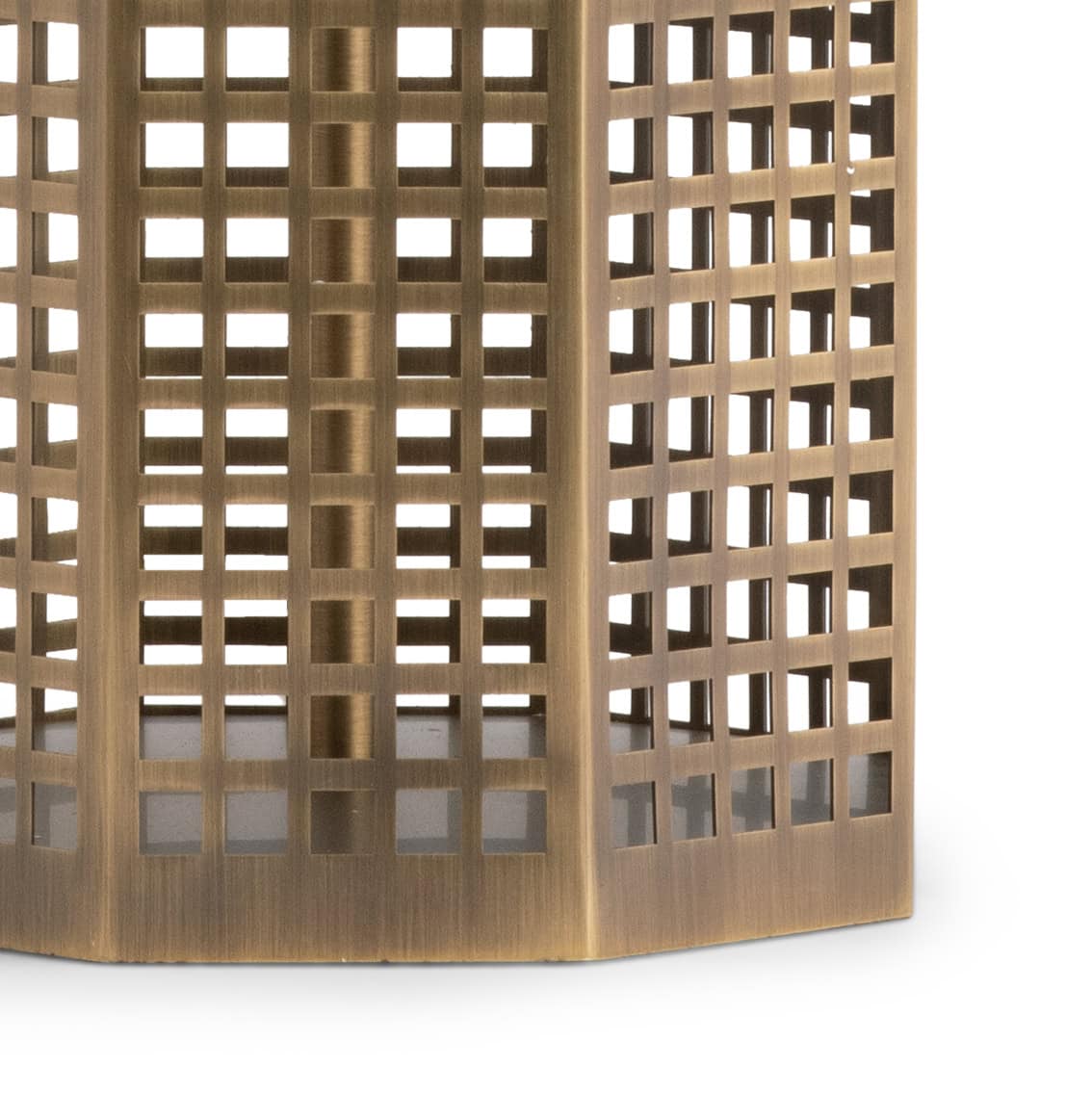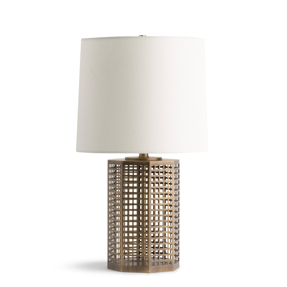 HEIGHT: 24.75″HFINISH: metal, antique brass finishSHADE: tapered drum; 13″ø(t) x 14″ø(b) x 11.75″HSOCKET: 150W 3-wayWEIGHT: 8 lbs