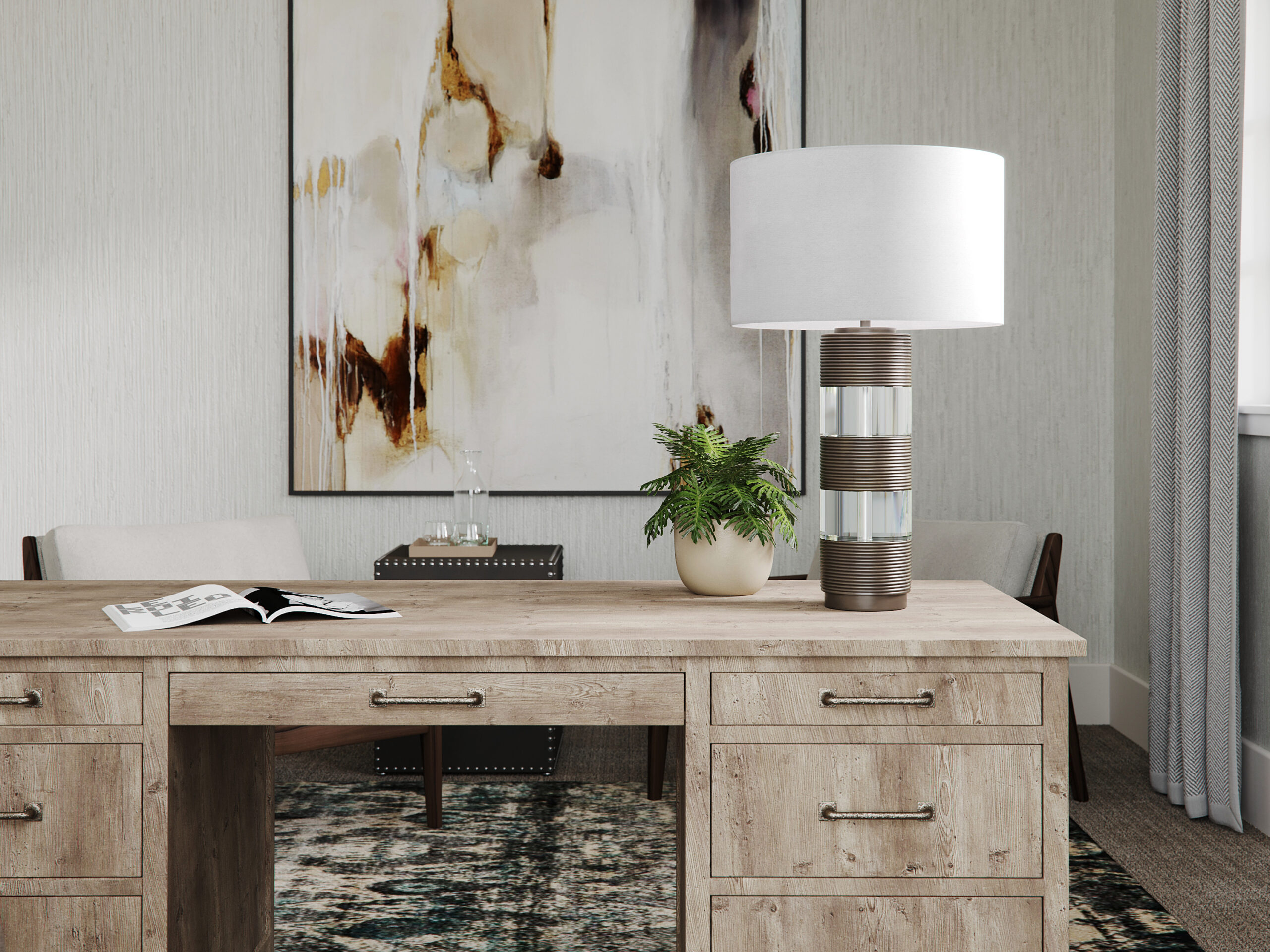 Bronze, metal and crystal play nicely together in this lamp to create an industrial-meets-chic statement perfect for a modern bedroom or living room. The ribbed finish on the metal provides a high-design detail, while the Off-White linen drum shade adds that final crisp and clean detail.