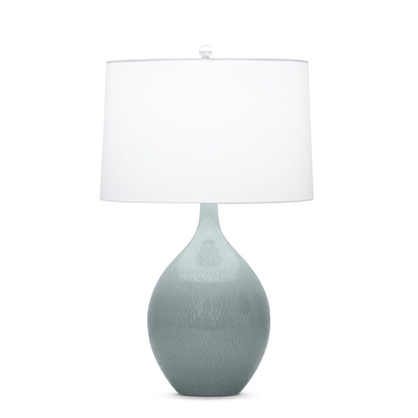 A mouth-blown glass body is covered in a Grey-Blue finish on this table lamp, which features a beautifully delicate and handmade textural element as well. This muted tone would fit perfectly into a coastal cottage or a soft modern retreat, with its quality Off-White cotton shade.