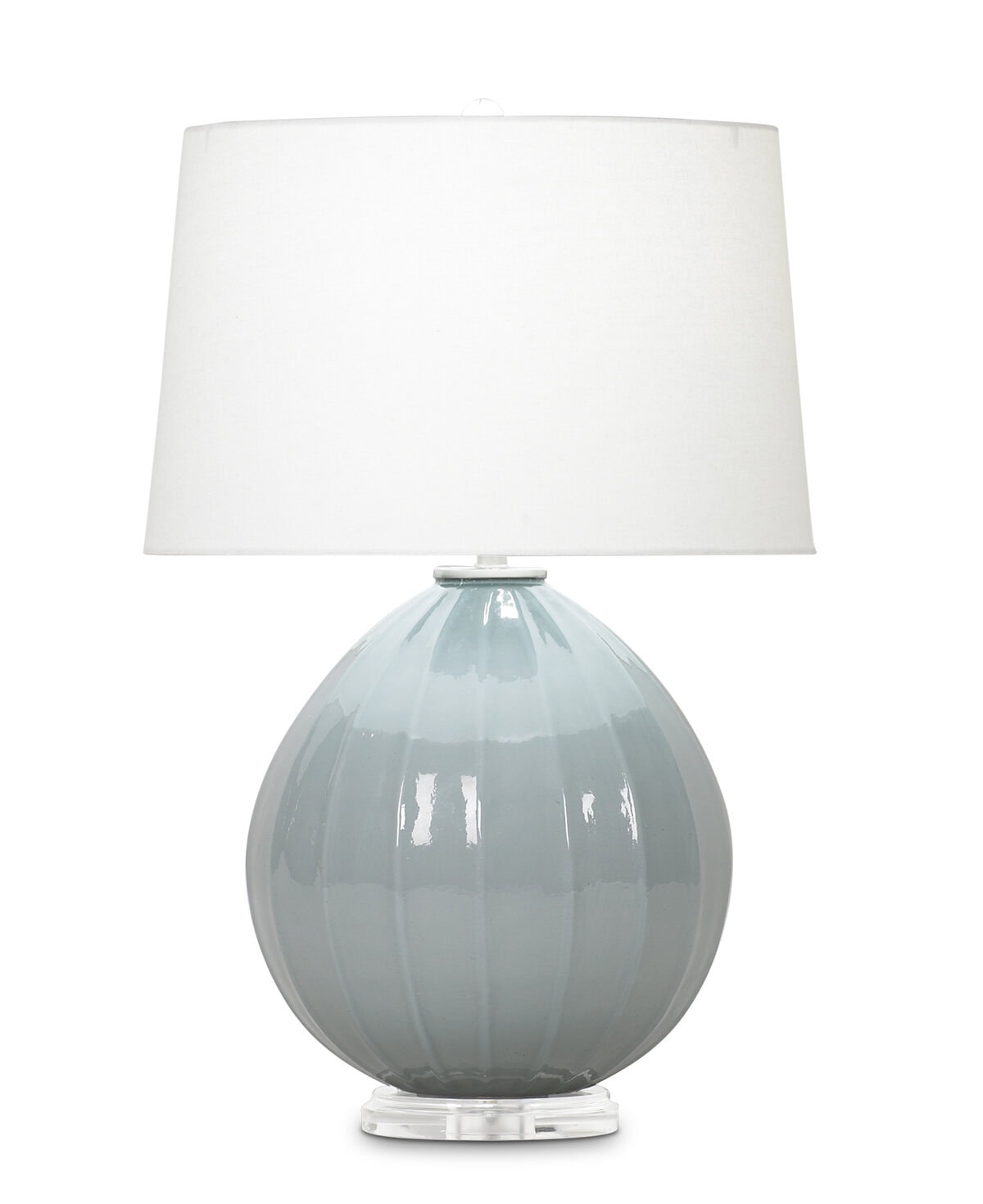 The round, mouth-blown glass body of this table lamp wears a muted Grey-Blue finish that would blend beautifully with various design styles. This handmade lamp has a simple yet elegant aura and presents an almost organic quality, capped with a clean Off-White linen shade.