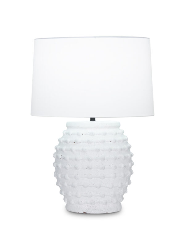 Perfect for drawing together various colors and textures within your decor, the bobbled detailing on this white ceramic table lamp adds striking depth and interest to its clean design. Topped with a clean white cotton shade, this versatile light source will bring a contemporary touch to bedside tables, end tables and console tables.