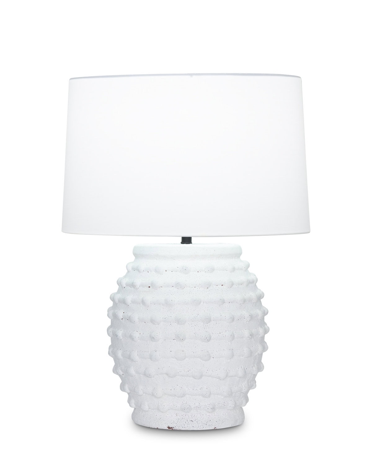 Perfect for drawing together various colors and textures within your decor, the bobbled detailing on this white ceramic table lamp adds striking depth and interest to its clean design. Topped with a clean white cotton shade, this versatile light source will bring a contemporary touch to bedside tables, end tables and console tables.