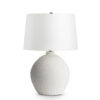 The Trudelle Table Lamp pairs a dramatic ceramic base with an off-white linen drum shade. The gently mottled white finish on the ceramic base lends a rustic appeal to the lamp that will add texture and interest to your home decor.