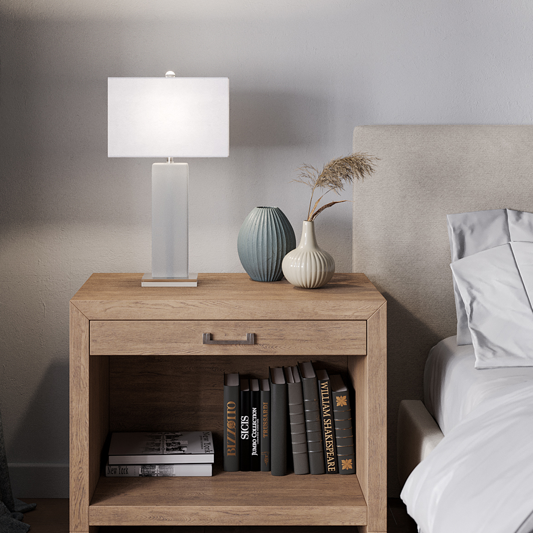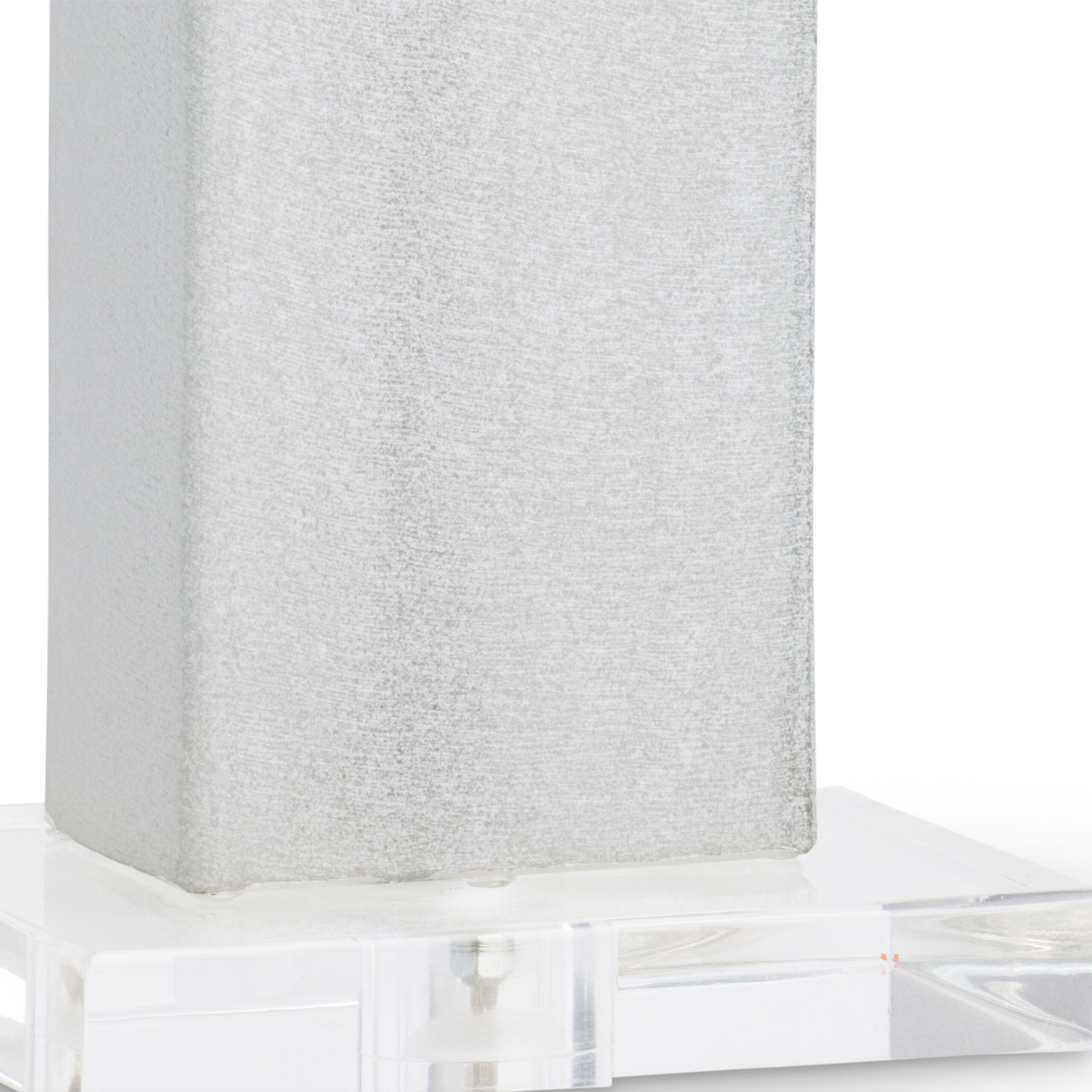 Despite its short stature, this table lamp makes a statement. Mouth-blown glass wears a Hand-Etched Ice finish on the body. An acrylic base and white, rectangular shade bookend this quality piece.